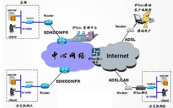 中心IPSec VPN产品采用在IP 传输上通过加密隧道的方式,利用Internet建立企业内部专网,保证数据传输的安全性,实现企业分支机构与总部之间的数据、话音、视频业务互通。