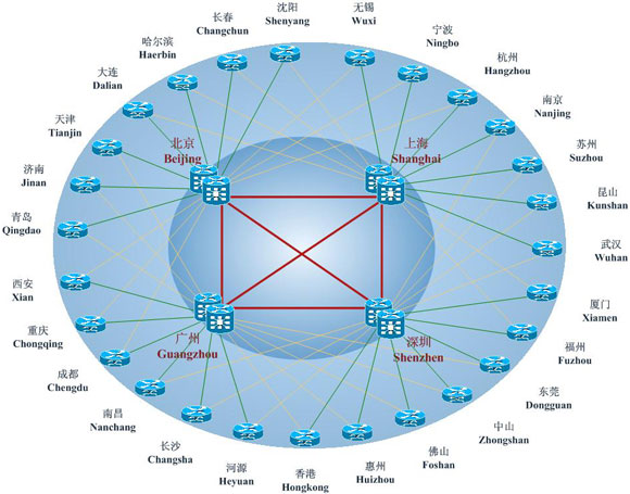 IP-VPN骨干网络平台以深圳、北京、上海、广州等11个城市为大陆骨干节点;以无锡、福州、成都、厦门等19个城市为大陆虚拟节点,以香港为海外节点,覆盖全国,同时借助于国外合作伙伴的网络拓展至全球。
