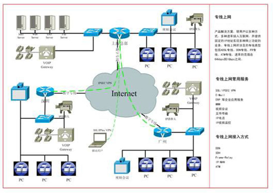 [光纤专线接入上网]IP城域网(MAN,Metropolitan Area Network)指覆盖城市范围、为城市里各类用户提供宽带(通常2Mb/s以上)接入的数字通信网络,IP城域网采用光纤作为主要的传输媒介来实现数据传输的。标准接口为:Rj45快速以太口。目前可提供2Mb/s、5Mb/s、10Mb/s速率的IP城域网传输电路。 位于深圳的中心节点机房和中国电信、中国网通、中国联通、中国电通、广东盈通、中国铁通、中国卫通、天威视讯等电信基础运营商均实现了资源互联,并同时拥有中国电信互联网骨干出口、中国网通互联网骨干出口及香港国际互联网骨干出口。 企业专线上网主优势。
